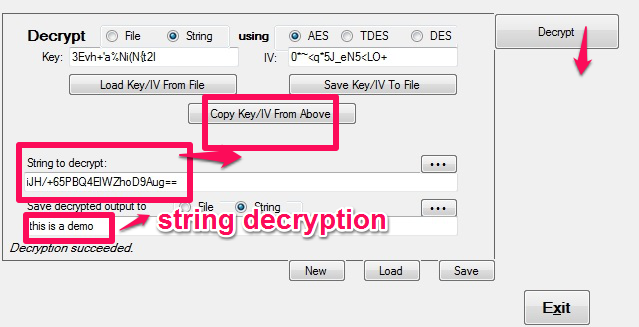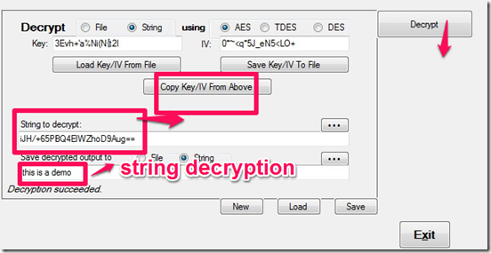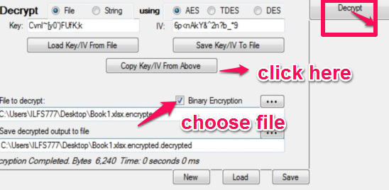 • If you saved key / IV value to a file, you need to provide those values first, by clicking on “Load Key/IV from File” in “Decrypt” section.