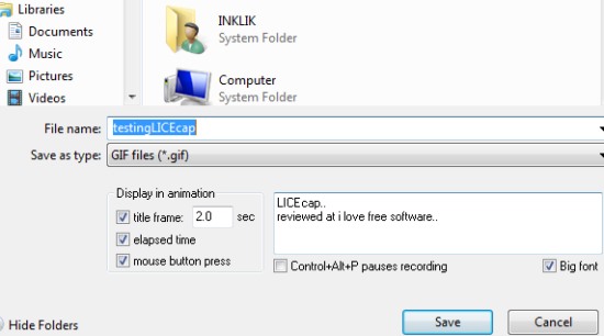 After this, tap on Record button and Save as window will open up. In this Save as window, you can write desired name and file type for output. As mentioned earlier, it also lets you save output in *.lcf form. Benefit of saving output in this form is that it allows higher compression ratio as compared to gif. Also, it provides higher quality and accurate time-stamping. But if you will save output in lcf form, then you will need to download and install REAPER (a digital audio workstation) that supports lcf files and allows you to convert lcf to gif or other video format.