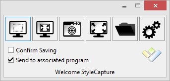 Hornil StyleCapture has got a simple and minimal interface. After launching the app, a window will open up containing icons (buttons) for taking screenshots in supported modes. The first two icons corresponds to Rectangular Capture, next is Window Capture, and the fourth-one is for Full-Screen capture. Clicking on any of these icons will activate that particular mode, and allows you to capture screenshot easily.