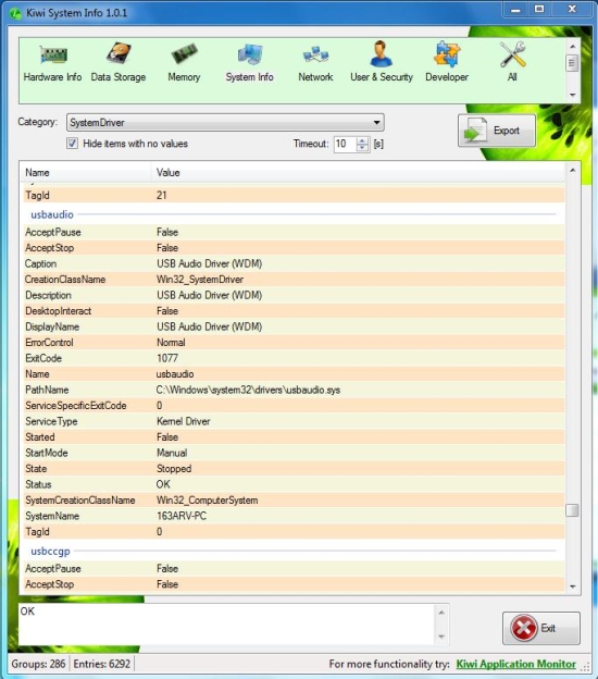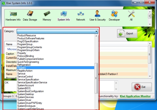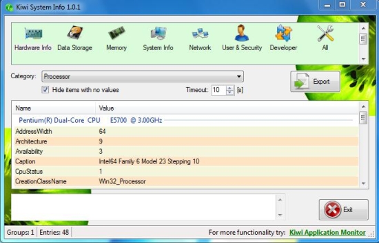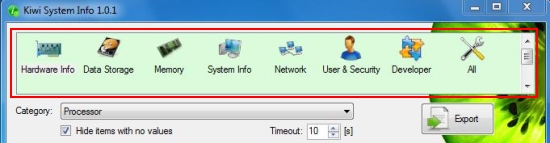 You can click on any category from the drop-down to retrieve information on that. Kiwi System Info works quickly and takes less than 10 seconds to browse and display information. You can optionally hide the entries which contains no values.