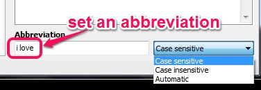 Once the snippet is completed, set an abbreviation, which could be anything, to insert text while working with an application. Abbreviation can be set to case-sensitive, case-insensitive, or in automatic mode.