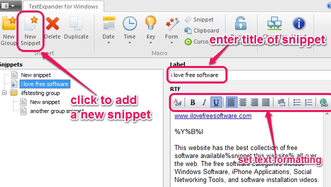 Along with this, you can even set text formatting which is a useful thing present in this software. You can set text alignment (left, center, right, etc.), can make text bold, italic, underline, add bullets and numbers, etc. Hyperlinks can also be inserted to text. Add things according to your wish and complete your snippet.