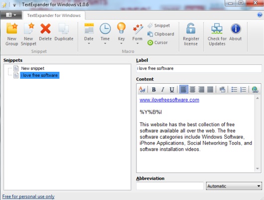TextExpander (also known as TextExpander for Windows) is used to automatically insert commonly used phrases, text, or lines in an application. It comes in handy when you have to add text that you need frequently. Instead of typing same text multiple times, you can create a snippet using this software, and can add text in that snippet. For each snippet, you can set any abbreviation (like group of words or a single word) that helps to automatically insert text of that snippet.
