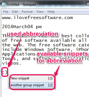 Similarly, you can create more and more snippets, and add text for those snippets. After this, you can minimize this software to system tray and can work on any application. Now, whenever you have to insert a required text, just type the abbreviation. You will find that snippet text associated with that particular abbreviation is inserted automatically.