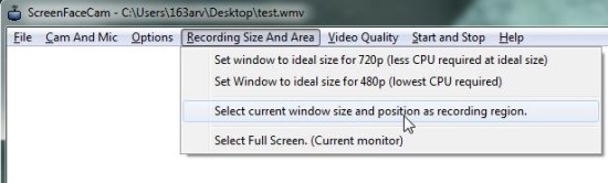 ScreenFaceCam allows you to record full screen or selected screen region. The region selection can be made by resizing the program window and choosing “Select current window size and position as recording region” option.