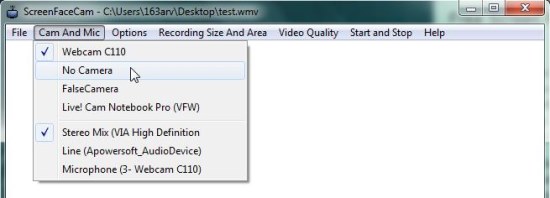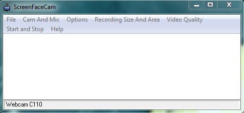 ScreenFaceCam opens as a plain blank window that looks more like a text editor rather than a screen recorder. The window contains a menu bar at the top that gives access to all common options of this free screen recorder. The “Cam and Mic” option lists all audio and webcam sources attached to your system. You can choose a desired webcam device and audio source and proceed with selecting a recording area.