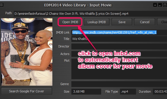 - If you have to automatically insert missing album cover, then you can use Open IMDB button. It will open imbd.com webpage from where you can search for particular video and can copy paste result URL at required box. Just after providing the URL, use Lookup IMDB button to automatically insert album art.