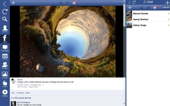 You can see that the interface of this Windows 8 Facebook app is divided into three parts: the navigation bar is located on the left part of the interface while main interface is in the middle and the chat windows is located on the right side of the app window. The notifications are located in the top part of the app window and are shown both in the main window as well as the chat window; this kind of repetition and redundancy makes the interface look a little bad.