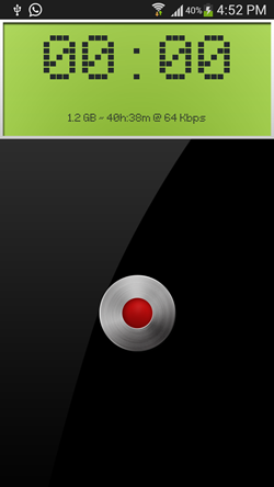 Here, you can see that the app has a neatly placed Record button at the center of the screen. At the top, it shows you the total time available for recording (this is calculated by the amount of free space available), and above this it also shows a timer wherein you can see the time for which the recording has been running. As in the above screenshot, the recording isn’t active, hence the timer is fixed at 00:00.