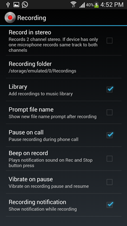 You can access the General Settings (portrait mode, theme settings etc.), Recording settings (various settings which allow you to change the folder in which recorded files are stored etc.), tweak the Microphone settings (enable or disable noise cancellation, etc), Encoding Settings (allows you to change the bitrate of recording, the default bitrate is 64Kbps, you can tweak it to 320 Kbps), Automation settings, link the app to your Dropbox account etc. Below screenshot shows a preview of what the Recording settings look like.