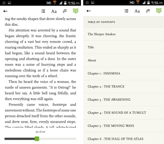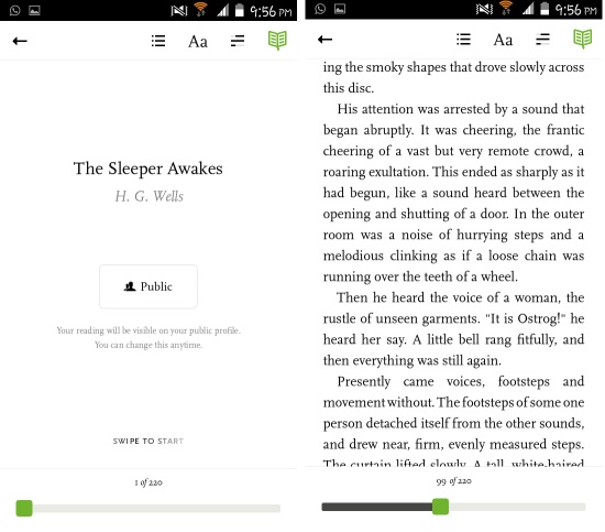 When you open an ebook in Readmill, the reading interface will be as seen below. After a few seconds the menu bar and page slider disappears, so that you have a clean UI which focuses on reading. The interface in total is beautiful, minimal, and emphasis is given on the rendering of fonts. Simply tap anywhere if you would like to bring back the controls. Swipe right to left to get to the new page and swipe to the right from the left to go back. The seek bar below can be used to jump to the page of choice with ease.