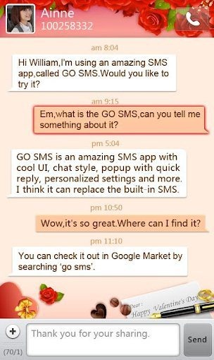 GoSMS Valentine’s Day is a free Android theme app which offers a nice SMS theme on Android. This Android valentine theme is a nice SMS theme to customize your GO SMS app background into a valentine mode.