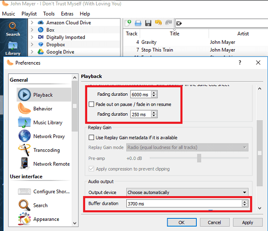 Using this player is very simple. Just get it from above URL and then open it. After that, from the Tools > Preferences menu you can open the Preferences window. Next, from the Preferences window, you can use the “Playback” section to enable the fading and buffer duration. After configuring these, you can return back to the main interface and then add your songs in it to play them. Those tracks will play in gapless playback manner.