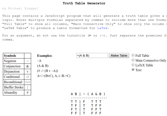 Truth Table Generator by Michael Rieppel(homepage) is one of the best free tool to create a truth table from any expression. This is an open source tool that you can use offline as well. You get its source code and host it yourself or run it locally. It lets you choose different type of truth tables and it supports the different type of symbols as well for the input boolean expression. Overall, the tool is simple and you just enter the boolean expression and get the table. Simple as that.