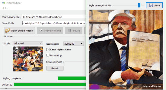Once you do that, simply hit “Create Artistic Style” button to apply the art filter to the photo and convert it into a beautiful artwork. After it generates the resulting artwork, you can change the style strength to modify the filter density. One of the unique features of NeuralStyler is that apart from turning your photos into artwork, it also lets you apply art filters to your videos and GIFs. It imprints a small watermark at the bottom of the resulting photo.