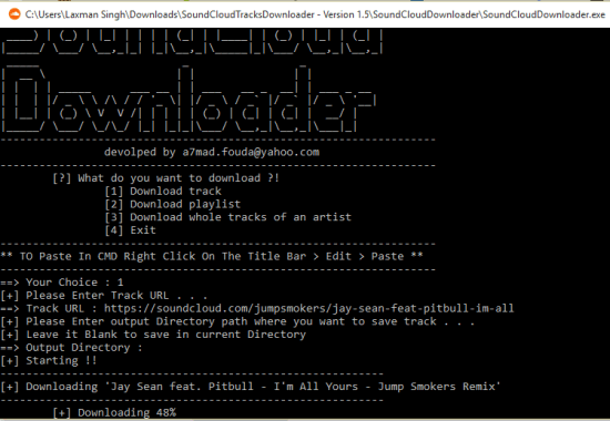 SoundCloudTracksDownloader has some different interface like Command Prompt and also comes with a very interesting feature. You can use this software to start downloading the entire playlist or a single track.