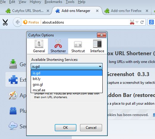 One click is all it takes to shorten a URL and copy it into the clipboard. I suggest that you add the Cutyfox icon to the address bar so that it’s handy when you need URLs shortened. By default the addon uses is.gd URL shortening service, but you can change this to bit.ly, goo.gl or mcaf.ee.