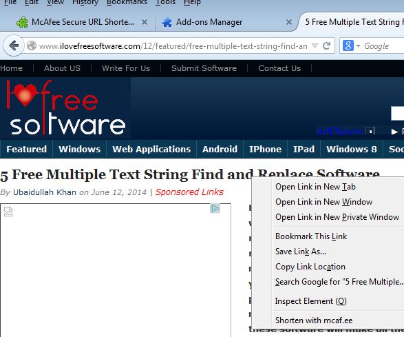 You might be wondering that how is this secure. Well, when you shorten a URL using this addon, by right clicking on an URL and selecting the “Shorten with mcaf.ee” option, URL that’s being shortened is first checked by McAfee to make sure that it doesn’t contain malware. If everything’s OK, then the URL is shortened and copied to the clipboard.