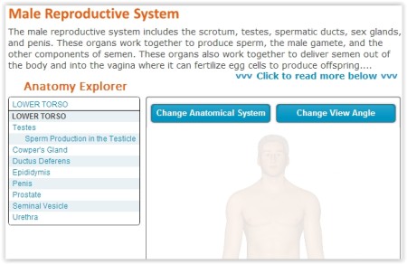 The first website to learn about human reproductive system is InnerBody. It provides you a detailed explanation of all the parts of a male and female reproductive system separately. You can read all the details along with a well designed virtual diagram. The website not only provides information about reproductive system, but also of the other systems in a human body. A diagram is provided along with all these explanations. You can even change the angle of these diagrams for better understanding.