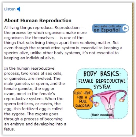 KidsHealth is another website that you can visit to learn about human reproductive system. This is a vast website that covers a lot of other topics as well, and human reproductive system is just one of the many topics you can read about on this website. It gives you a detailed explanation of the reproductive system and all the parts are explained thoroughly. Diagrams of male and female reproductive system are also provided. You can click on the provided link to view these diagrams. One interesting feature on this website is you do have to necessarily read out all the information provided. You also have the option of listening to them by clicking the “Listen” option shown on top.