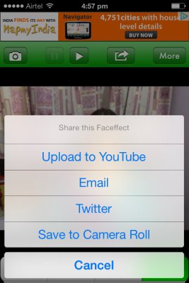 The next button on the toolbar with an arrow is for sharing, as seen in the screenshot below. You can share the photo you created using effects via email, Twitter or can even save it to your photo gallery. The app also gives you an option to upload the effects you created in form of a video on YouTube. As soon as you click this option the app will process your video and take your to your login page for YouTube. Once you login, the app will ask for authorization to upload the video. After that it will start the upload. This is where my testing didn’t go through. As soon as I reached this step there was an error and the app crashed. So could be a problem that needs to be fixed by the apps developers.