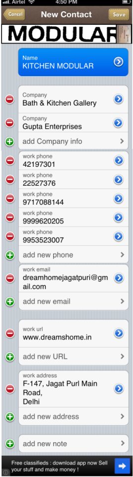 The app the automatically reads the content on the business card and puts all the text in respective fields like seen in the below screenshot.