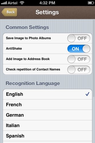 The settings option at the bottom of the homepage lets you change various options. You can choose and switch amongst 7 different languages which the app supports. Turn on the Anti Shake option to help you while you are clicking a photo of a business card. Gives you the option to save the business card image in your camera roll. Checks for repetitions in contact names.