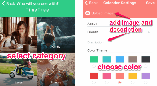 As soon as you open the app, it will ask you to whom you want to share the calendar. The available categories to whom you can share the schedules are Friends, Family, Private, Lover, Hobbies, Circles, etc. Select any category and proceed further to upload an image, add a description, and choose the color theme. The following screenshot shows how to create a new calendar.