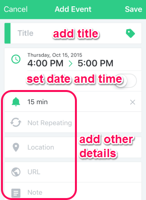 After you create a calendar, simply tap any date or use the “+” icon at the top right of the screen to add events or schedules. Add a title, assign the date and time, set a reminder, share location, add notes, etc. and save the event. The created events will be visible on the calendar as we have seen in the first screenshot. The following screenshot shows how to add a new event.