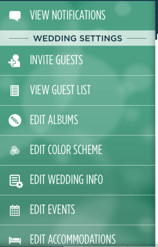 The options for adding info and details for the wedding can also be accessed via left sidebar. It includes all the options like Invite Guests, View Guest List, Edit Albums, Edit Wedding Info, etc.. and much more.