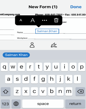 Step 4: To fill up value in the form, simply tap anywhere in the document to create an input field. After that, you can type anything in the field and also drag the field to place it anywhere on the document. It also lets you change the size of the text and put the words into small boxes.