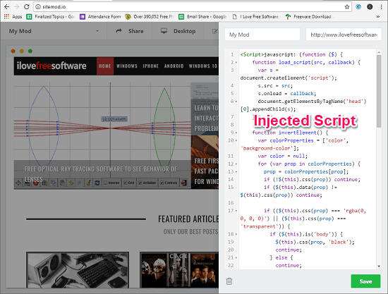 Here is a free service to inject scripts to a live website to see real time changes. The web service which lets you do it is called Sitemod.io and you can use it to do the same. The website requires a URL of the website that you want to modify and then you can inject your HTML/CSS/JavaScript/JQuery code in it for modification. The changes appear in real time and you can even share the result with people you like. And the best part is that, the changes you make to a certain page will be applied to the whole website. When someone browses the website using the URL you have shared, he will see the modified version of that website. Of course, nothing actually changes in the original website, and only the URL that you share will have the changes you made.
