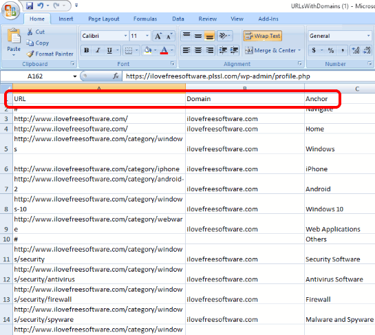 Step 4: Tap on Create CSV button. After this, it will generate the CSV file of that webpage in no time. When the file is downloaded to your PC, open it in MS Excel, or other CSV file viewer you are using on your PC. The CSV file contains all the URLs of that webpage, domains belongs to those URLs, and Other information neatly separated in different columns.