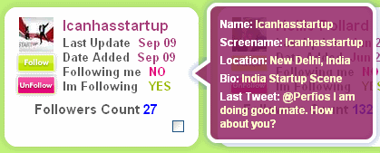 There are many software out there that show you those Twitter users whom you are following, but they are not following you back. However, what sets Tweepular apart is the way it presents all that information. It shows a small graphical rectange for each of the Twitter users that are not following you back. Each rectangle shows real name, # of followers, last activity date, date account added, and their Twitter photo. If you mouse over any of the rectangle, you get additional information, like Twitter username, real name, location, bio, and even last tweet.