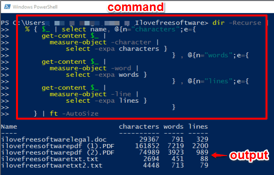 This is the most powerful option and really helpful when you want to find total words, lines, and characters for all files including their file names available in a folder using PowerShell.