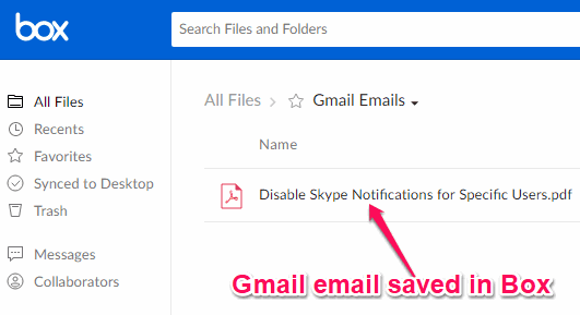 The email will actually convert into a PDF file and the attachments (if any) will be saved separately and in original format. Similarly, you can save all the emails from Gmail inbox to Box.