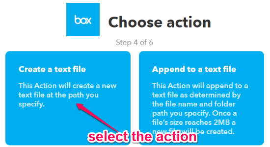 Step 3: When you’re done selecting the trigger, click on “That” option to proceed and choose the “Action” service. You need to choose “Box” and then select “Create a Text File” as the action in response to the trigger which you’ve selected.