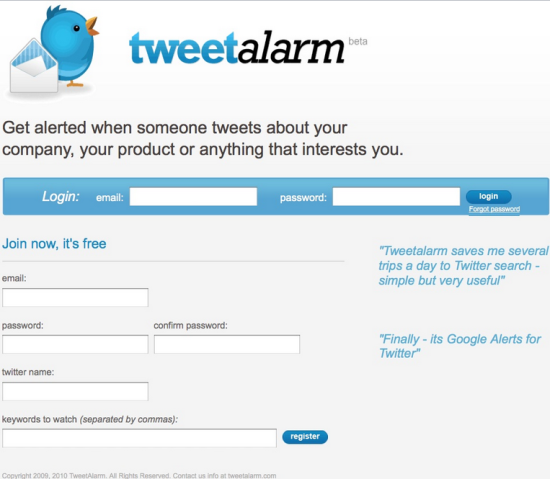 In short, TweetAlarm is an excellent Alert Service for Twitter that notifies you through an email when someone tweets about things related to you or your work.