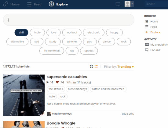 8tracks is a free internet radio website that provides features similar to Rdio. This website lets you stream user-curated playlists. You can explore and choose playlists based on your mood, such as: Study, Chill, Sad, Rap, Upbeat, Dance, and more. If you are an artist or even a regular user, you can also create a playlist with 8 or more tracks, cover art, and share with others.