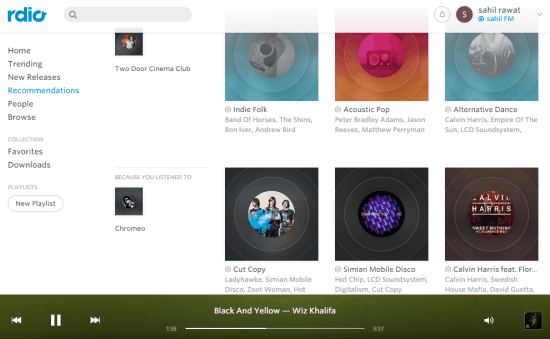 Rdio (free subscription) is another option or say a good alternative to SoundCloud. It lets you track and listen to new releases, find trending music, follow people, and get recommendations to explore more music. You can also add radio stations to favorites and playlist to play all the songs/albums available under those stations. Unfortunately, there is no scope for artists to upload their tracks, but it is good for users who want to stream music and add them to their playlist.