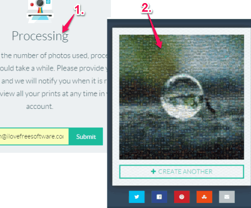 After selecting the main image, just tap on Create button. All your photos will process for generating the mosaic. It may take some time depending upon the total number of images. You can submit your email address to get notification when mosaic is generated. After generating the mosaic, you can preview it, share it with people, but cannot download it.