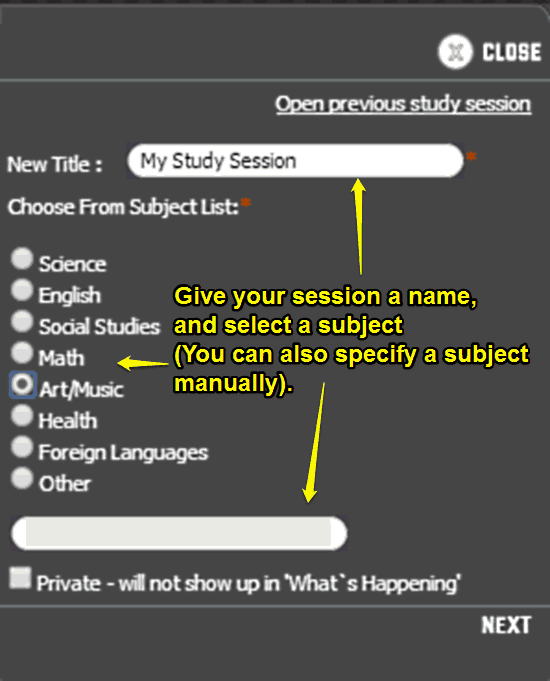 Step 1: On the home screen, click Start study session. Give your session a name, as well as select the subject it belongs to (You can also specify a subject on your own, if the one you’re looking for isn’t one of the listed options). You can also choose to make the study session private, in order to prevent it from appearing in the What’s Happening feed section in the left pane. Once done, click Next.