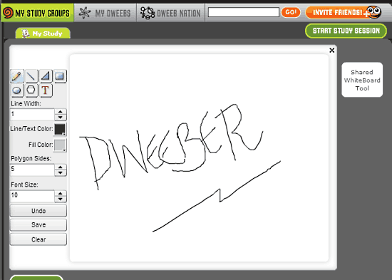 Dweeber offers a shared whiteboard that lets you and your study group members to collaborate and brainstorm on ideas in real-time. The whiteboard lets you create simple lines, and polygonal shapes. You can insert text if you want. All of the changes made by group members on the shared whiteboard are rendered instantly. Here’s a little animated graphic, showing it in action: