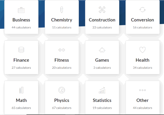 Here is a free calculator website that supports 300+ calculators. It is known as “Omni Calculator“. From business calculators to financial calculators, Math to Physics calculators, Construction to Conversion calculators, different categories are available under which multiple calculators are present. So, this can be your single platform to perform different kinds of calculations. You don’t need any free account to use this app. Just access a category, select a calculator and start the calculation.