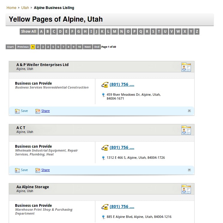 Select the state that you are interested in perusing and you will be greeted with a list of cities in that state. They can be listed based on the first letter of their name. Click on the name of the city that you are interested in browsing through, and you should be seeing what you see in the image above. Clicking on one of the business listings, you can get more details.
