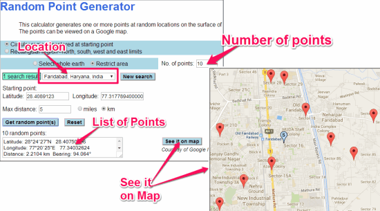 It creates a list of fixed number of random geographical points, that you can view on the map as well. You can choose the location, number of points, and area around the selected location in which you want to create the point.