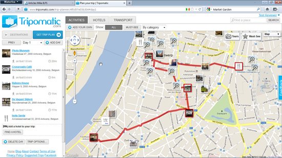 When you click on the pictorial icon for a point of interest in one of Tripomatic’s map views, you will be presented with a short description if the location and an option to add it to your itinerary for the day. As you select the locations that you wish to visit for the first day, including restaurants for meals, the icon for each location will be given a red outline, and the easiest route between destinations will be highlighted on the map. Additionally, the locations you choose will be listed in the left hand pane of the browser window. The list is built not based upon which order you select the locations, but their order on which the application decides they fall on the most logical route when driving.