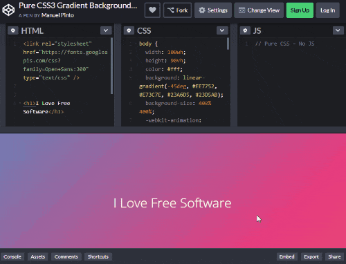 CodePen is an online platform to build and share coding templates. There is a CSS code template there named ‘Pure CSS3 Gradient Background Animation‘. This template offers a color-blending gradient animation. It provides you all the code for the animation; you can simply edit the code to reflect your customization.