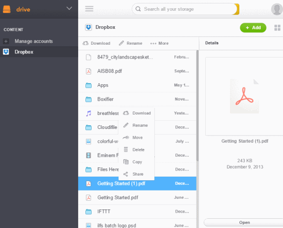 For all your connected accounts of online storage services, it provides multiple features. You can move files from one service to another, can upload and download data, check used and free space, share a particular file, and open any file directly with your associated account.