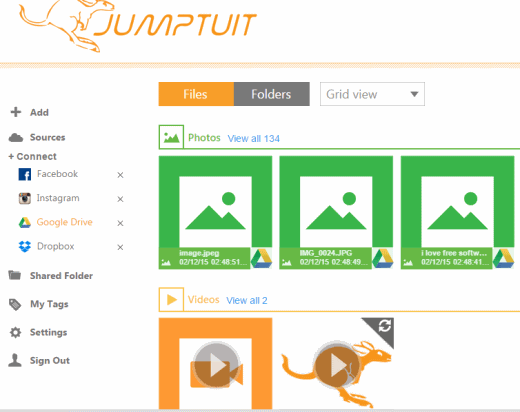 Jumptuit is also a very good website to manage your cloud storage accounts. It provides a beautiful interface and lets you connect a lot of services: SoundCloud, Vimeo, Xbox Live Music, Instagram, Amazon Cloud Drive, Google Drive, One Drive, Dropbox, Facebook, Flickr, Photobucket, etc.
